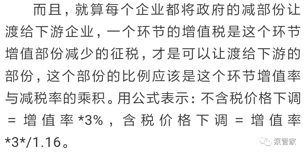 因此,从纯降税来看税负的下降,每个企业减税的空间,取决于该企业的增值率和上游企业的减税转移。实际上,上游企业也不可能是降价3%,合理的只能是将上游减税的部份转移到下游,正如我们分析的例子,税率降3%,企业降价1.2%。